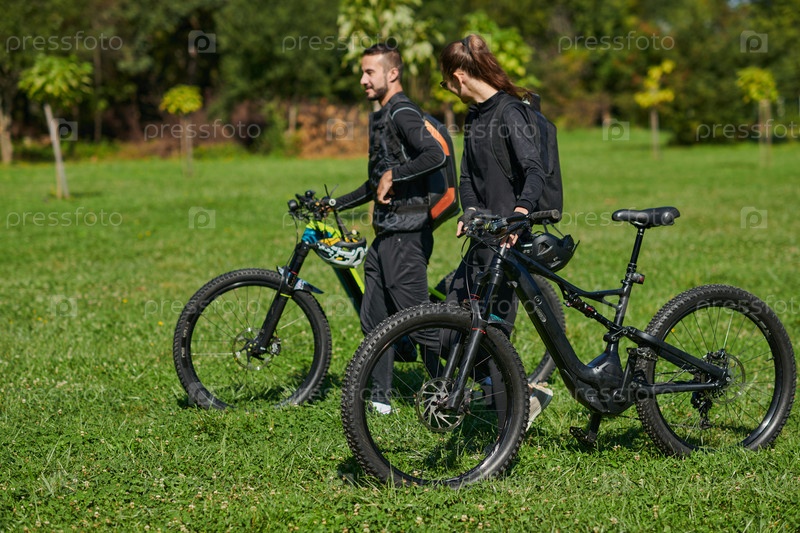 Счастливая пара, одетая в профессиональную велосипедную экипировку, наслаждается романтической велопрогулкой по парку, окруженному современными природными достопримечательностями, излучая любовь и счастье