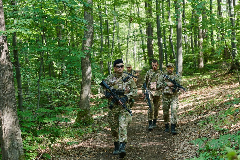 Специализированное военное антитеррористическое подразделение проводит секретную операцию в густом, опасном лесу, демонстрируя точность, дисциплину и стратегическую готовность