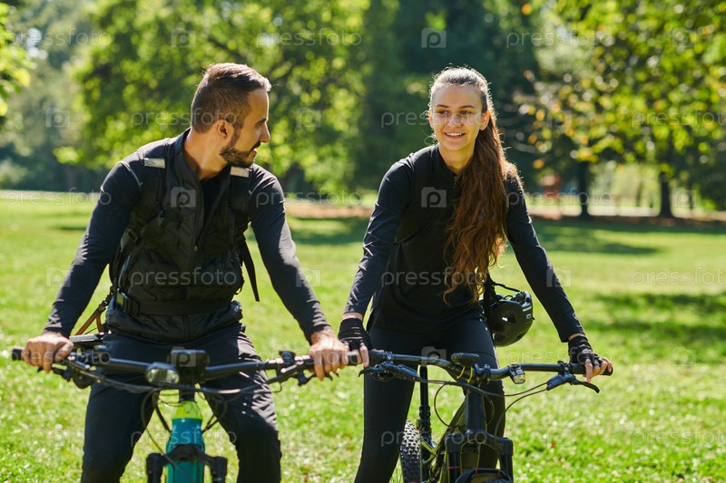 Счастливая пара, одетая в профессиональную велосипедную экипировку, наслаждается романтической велопрогулкой по парку, окруженному современными природными достопримечательностями, излучая любовь и счастье