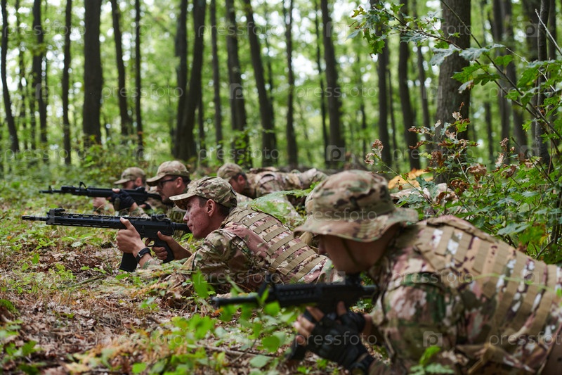 Элитные солдаты скрытно маневрируют через густой лес, замаскированные в специализированное снаряжение, отправляясь на секретную и стратегическую военную миссию