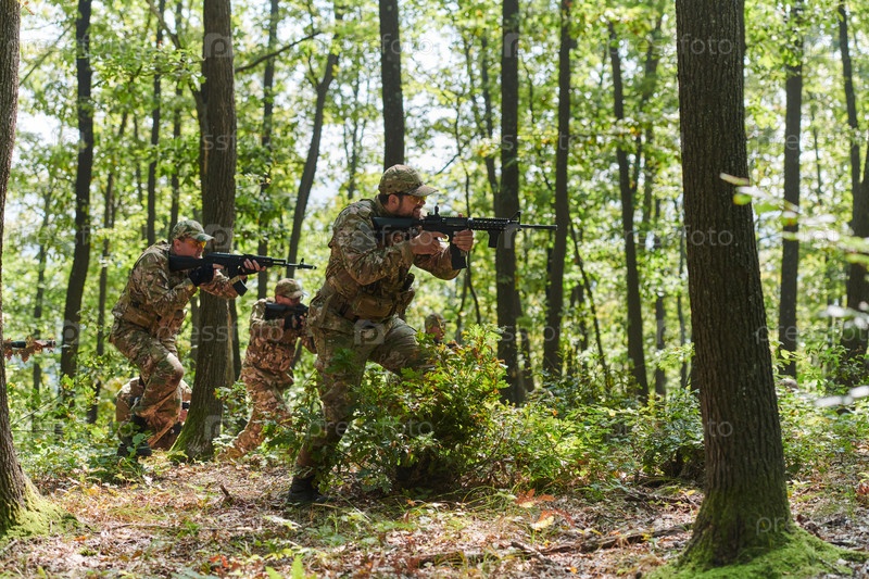 Специализированное военное антитеррористическое подразделение проводит секретную операцию в густом, опасном лесу, демонстрируя точность, дисциплину и стратегическую готовность