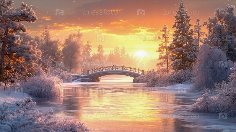 Зимний пейзаж с заснеженными деревьями и небольшим мостиком во время заката
