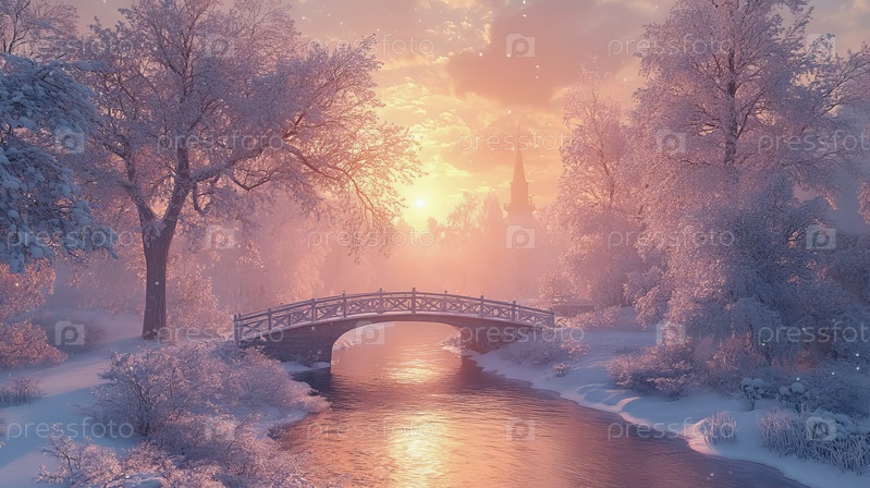 Зимний пейзаж с заснеженными деревьями и небольшим мостиком во время заката