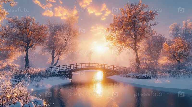 Зимний пейзаж с заснеженными деревьями и небольшим мостиком во время заката
