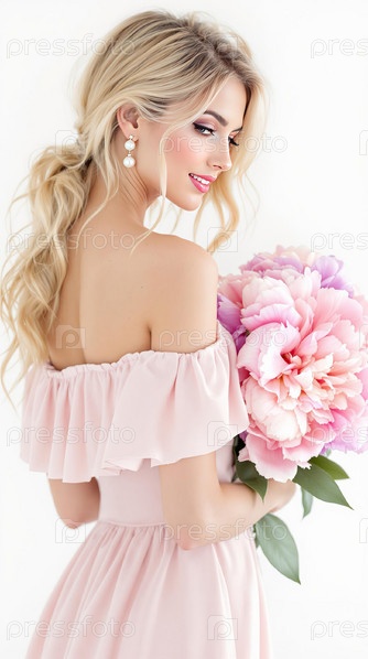 Блондинка в розовом платье с открытыми плечами держит большие пионы. Сгенерировано ИИ