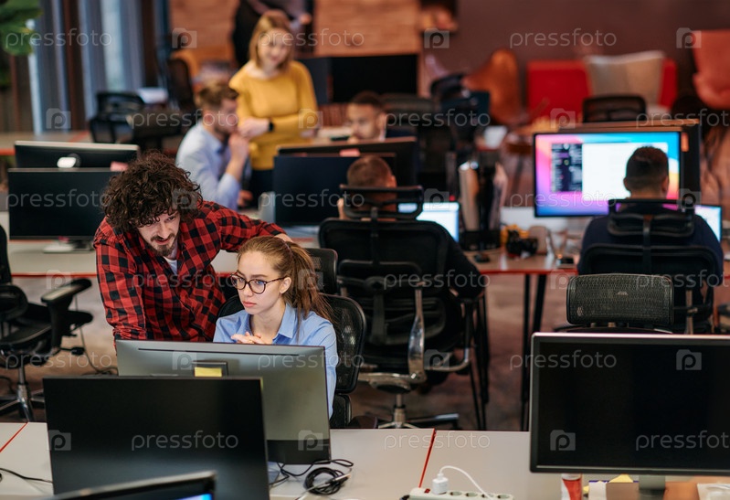 Коллеги по бизнесу, мужчина и женщина, обсуждают бизнес-стратегии, внимательно глядя на монитор компьютера, олицетворяя сотрудничество и инновации