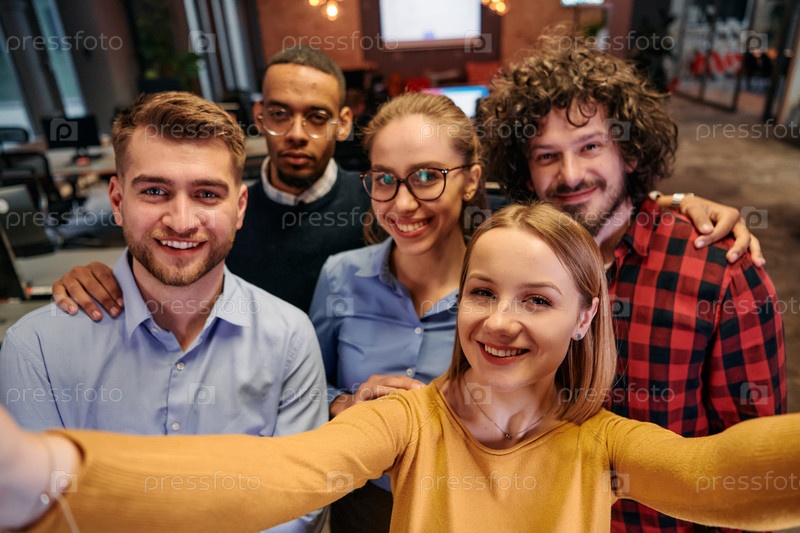 Группа разнообразных профессионалов в сфере бизнеса отдыхает от своих задач в современном офисе стартапа, чтобы сделать креативное селфи, демонстрируя командную работу и яркую корпоративную культуру