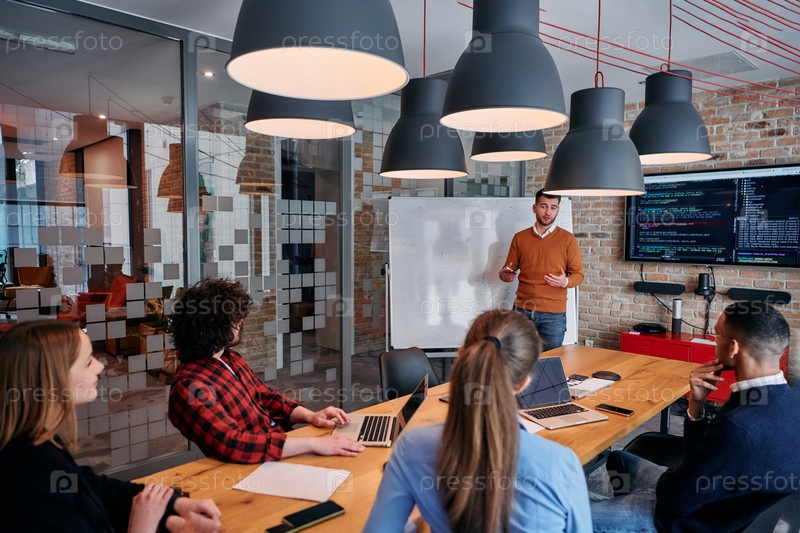 В корпоративной обстановке бизнесмен проводит совещание, страстно представляя бизнес-план своей внимательной команде, способствуя сотрудничеству и стратегическому мышлению