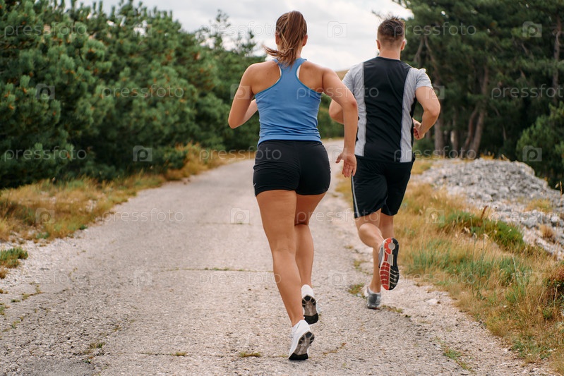 Пара в спортивной одежде бежит по живописной дороге во время утренней тренировки, наслаждаясь свежим воздухом и поддерживая здоровый образ жизни