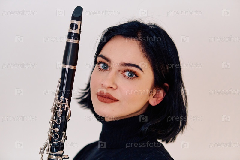 Изящная брюнетка-музыкант позирует с кларнетом на белом фоне