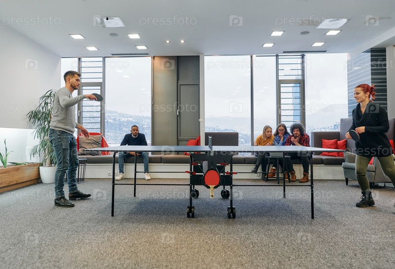 Коллеги по бизнесу отдыхают от работы, чтобы поиграть в настольный теннис, способствуя командной работе и товариществу на рабочем месте