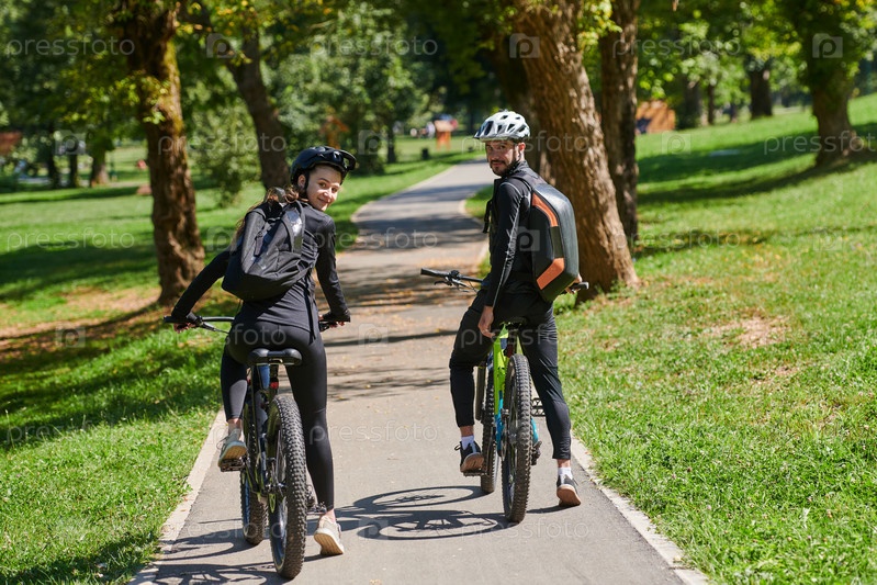 Счастливая пара, одетая в профессиональную велосипедную экипировку, наслаждается романтической велопрогулкой по парку, окруженному современными природными достопримечательностями, излучая любовь и счастье