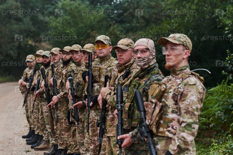 Солдаты-бойцы стоят вместе с оружием. Групповой портрет элитных членов армии США, военнослужащих частной военной компании, антитеррористического отряда