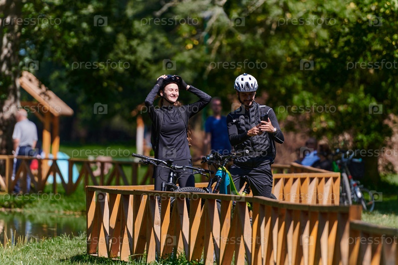 Счастливая пара, одетая в профессиональную велосипедную экипировку, наслаждается романтической велопрогулкой по парку, окруженному современными природными достопримечательностями, излучая любовь и счастье