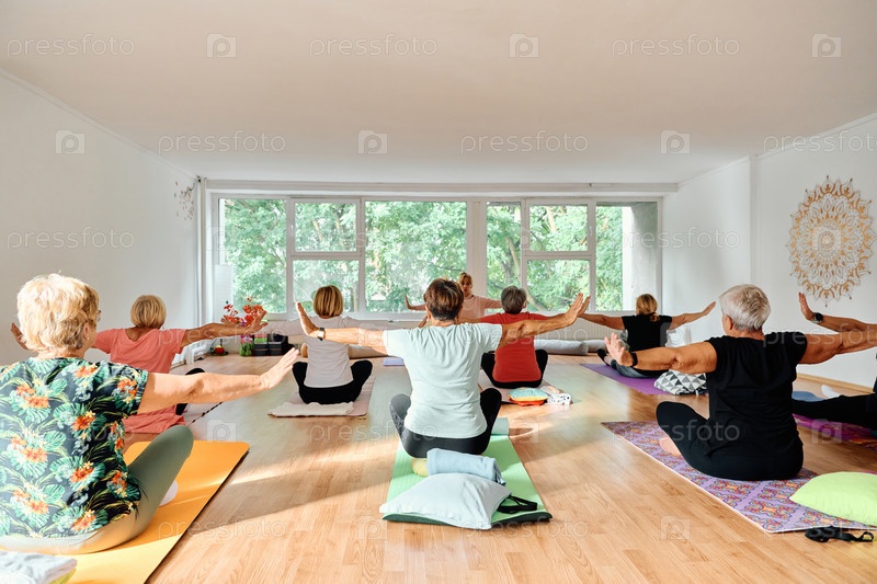 Группа пожилых женщин занимается различными упражнениями йоги, включая растяжку шеи, спины и ног, под руководством тренера в залитом солнцем месте, способствуя благополучию и гармонии