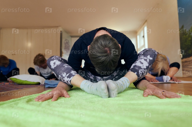 Группа пожилых женщин занимается различными упражнениями йоги, включая растяжку шеи, спины и ног, под руководством тренера в залитом солнцем месте, способствуя благополучию и гармонии