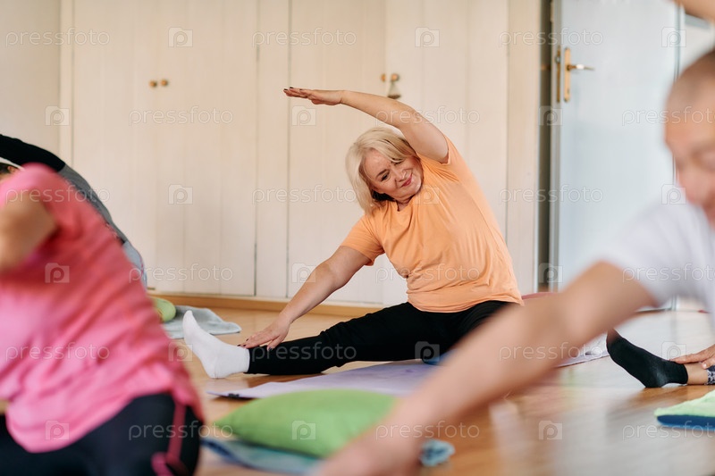 Женщины старшего возраста занимаются оздоровлением: йогой и растяжкой в залитом солнцем пространстве
