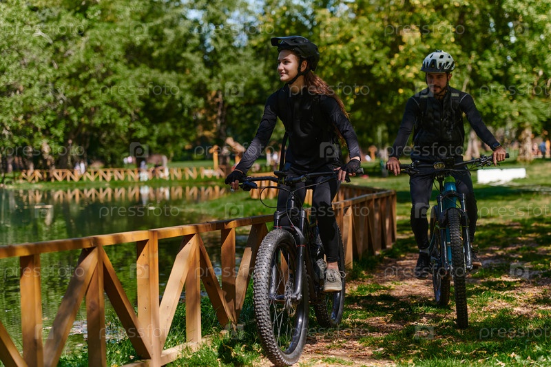 Счастливая пара, одетая в профессиональную велосипедную экипировку, наслаждается романтической велопрогулкой по парку, окруженному современными природными достопримечательностями, излучая любовь и счастье