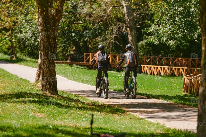 Счастливая пара, одетая в профессиональную велосипедную экипировку, наслаждается романтической велопрогулкой по парку, окруженному современными природными достопримечательностями, излучая любовь и счастье