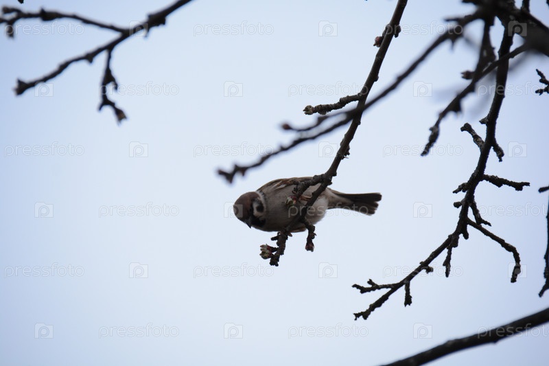 Птица на ветке на фоне светлого голубого неба