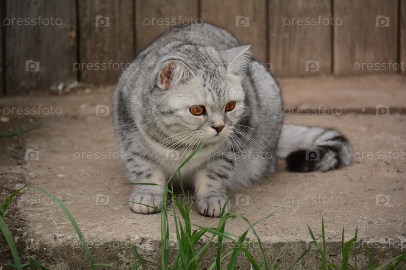 Красивая серая британская кошка сидит на бетонно блоке и смотрит в сторону
