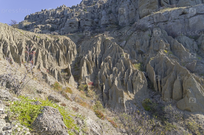Причудливый рельеф, возникший на глиняном склоне у подножья мыса Меганом в результате эрозии и выветривания. Крым. Середина октября, солнечно
