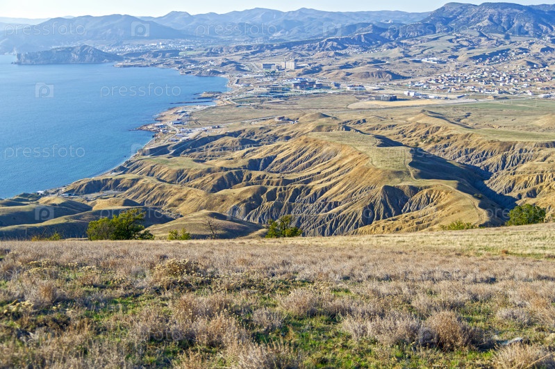 Глиняные овраги со следами эрозии почв и выветривания у подножья мыса Меганом. Крым. Середина октября, солнечно