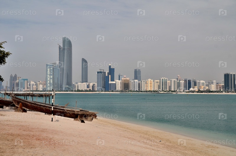 Старая лодка на фоне небоскребов в Абу-Даби, Объединенные Арабские Эмираты