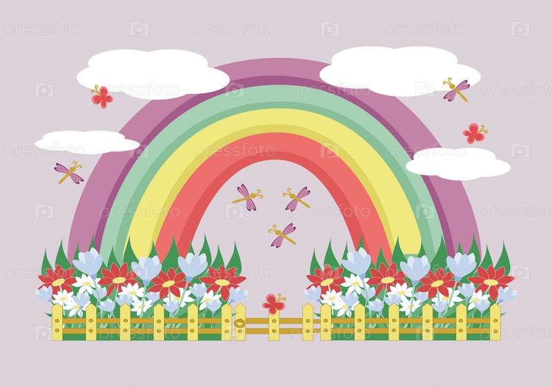 Радуга, бабочки, стрекозы и палисадник с цветами