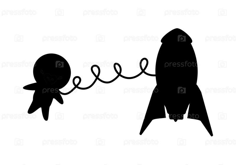 Черный силуэт астронавта в космосе и ракете