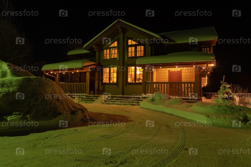 Деревянный дом с красивой новогодней подсветкой в ночное время