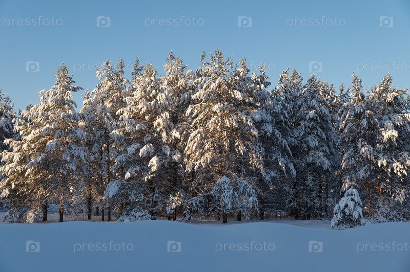 Зимний лес, освещенный низким холодным солнцем