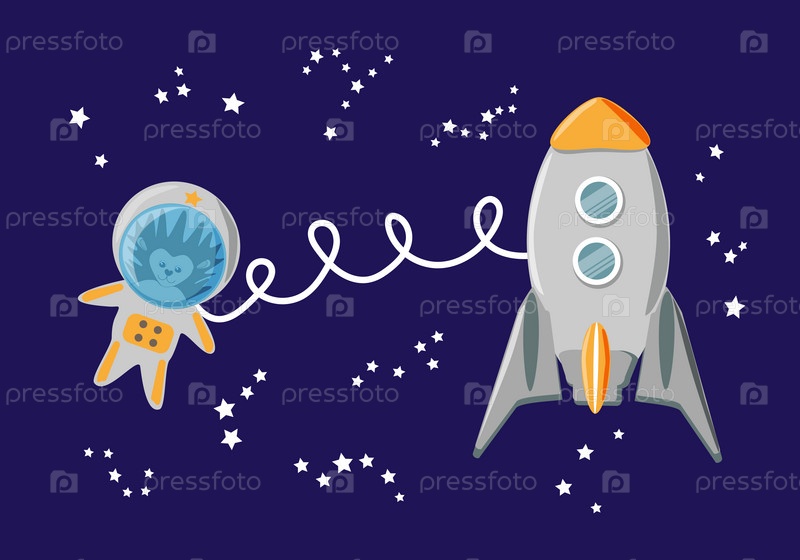 Ежик-астронавт с ракетой в открытом космосе среди звезд