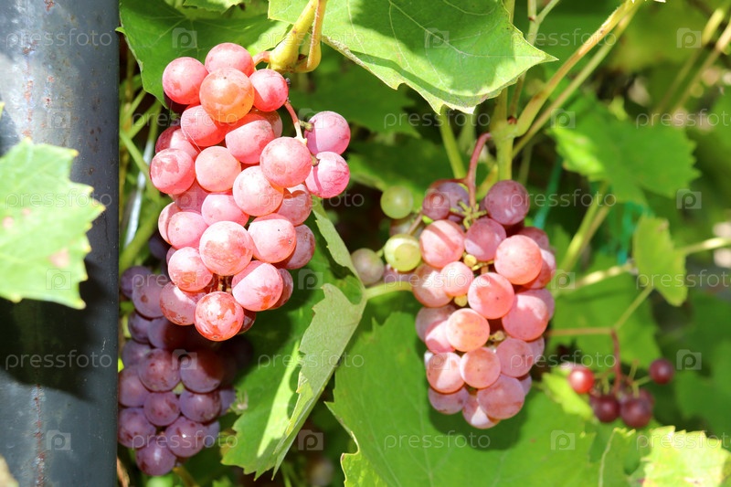 Розовый виноград на лозе, куст в солнечный осенний день