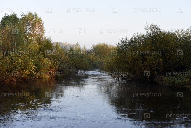 Осенний пейзаж голубого озера и желтеющих деревьев. Желто-зеленые деревья у реки утром