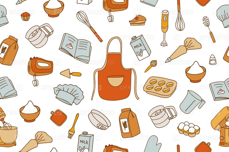 Красочный бесшовный узор из принадлежностей для выпечки. Кухонная утварь и одежда шеф-повара в стиле каракули. Векторная иллюстрация