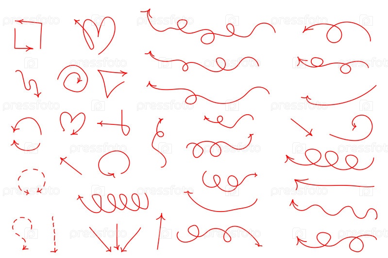 Изолированные векторные стрелки, нарисованные от руки на белом фоне. Прямые, изогнутые, круглые, многонаправленные стрелки