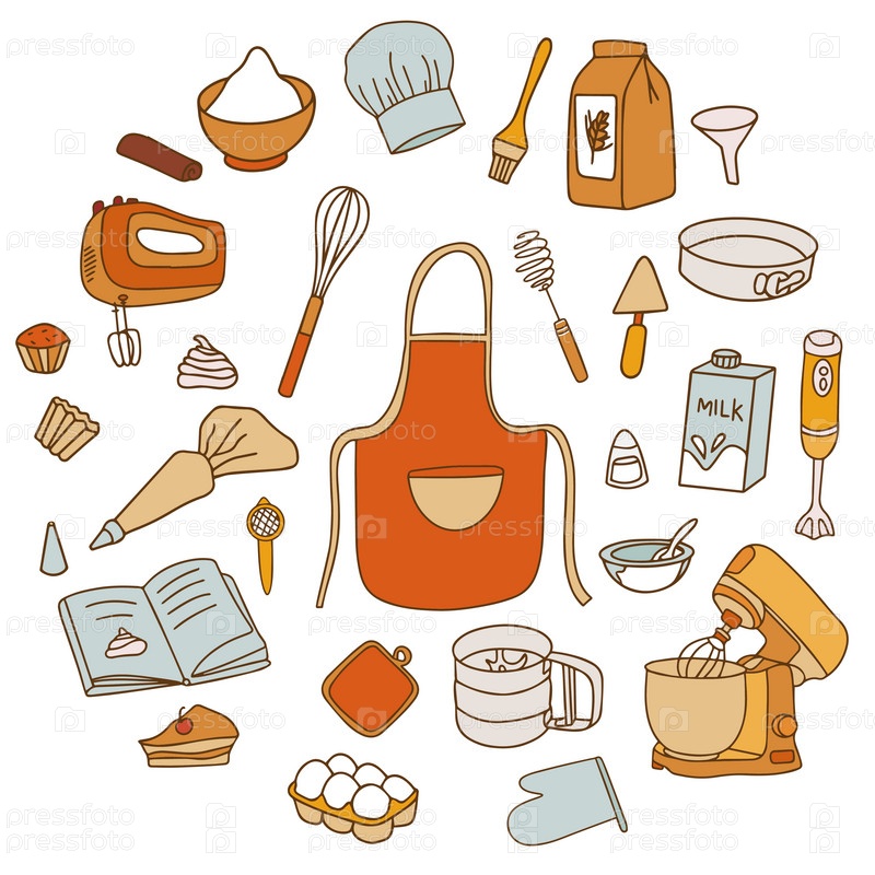Красочная коллекция принадлежностей для выпечки. Набор кухонных принадлежностей для приготовления пищи в стиле каракули на белом фоне. Вектор