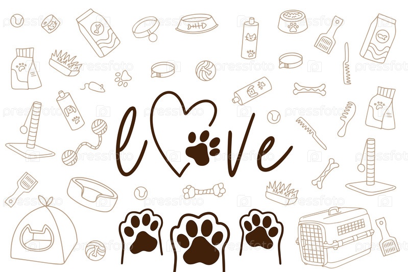 Рисованный ассортимент зоомагазина в стиле каракули Концепция любви к животным, надпись love.Векторная иллюстрация