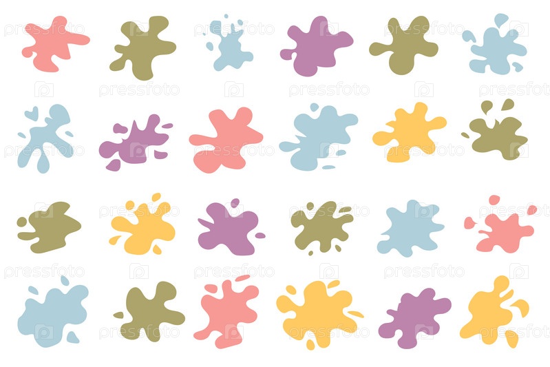 Набор красочных брызг. Яркие пятна, краска, набор элементов дизайна. Красочный набор брызг краски. Круглые плоские брызги, декоративные формы жидкостей. Различные брызги и капли