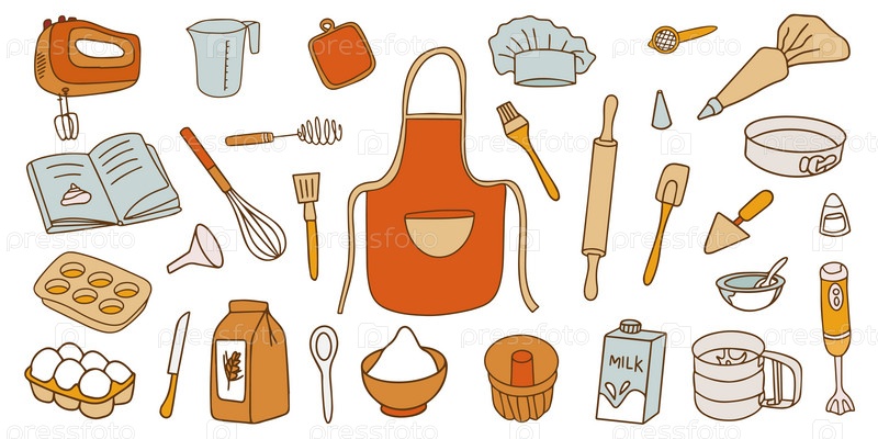 Красочная коллекция принадлежностей для выпечки. Набор кухонных принадлежностей для приготовления пищи в стиле каракули на белом фоне. Вектор