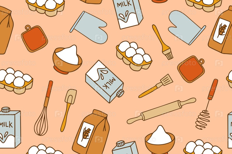 Красочный бесшовный узор из принадлежностей для выпечки. Кухонная утварь в стиле каракули