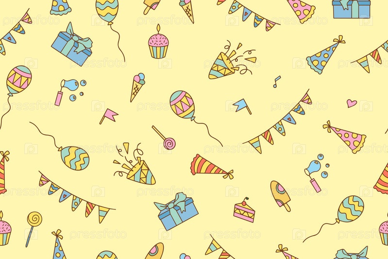 Праздничный бесшовный узор из красочных элементов в стиле каракули С Днем Рождения, изолированный на белом фоне. Векторная иллюстрация. Векторная иллюстрация