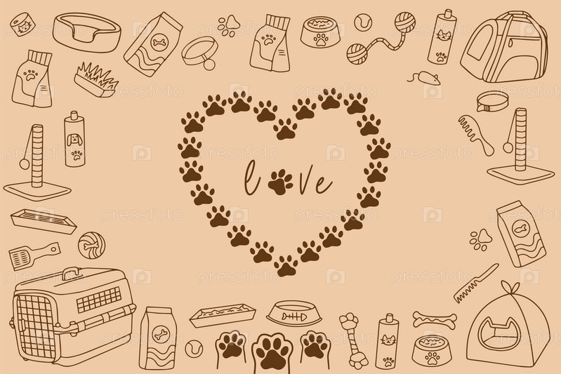 Рисованный ассортимент зоомагазина в стиле каракули. Векторная иллюстрация