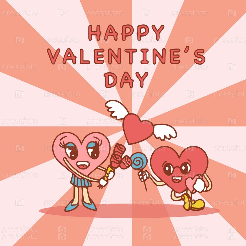 Милые забавные сердечки на ретро фоне. Милые символы любви с лицами в разных позах, руками и ногами, забавными положительными эмоциями. Векторная иллюстрация ко Дню святого Валентина. Векторная иллюстрация