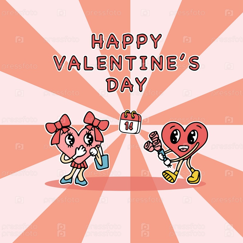 Милые забавные сердечки на ретро фоне. Милые символы любви с лицами в разных позах, руками и ногами, забавными положительными эмоциями. Векторная иллюстрация ко Дню святого Валентина. Векторная иллюстрация