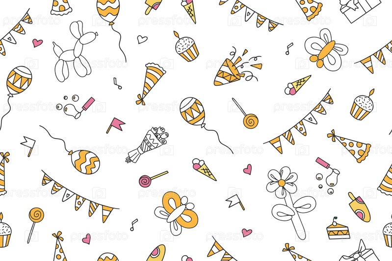 Праздничный бесшовный узор из красочных элементов в стиле каракули С Днем Рождения, изолированный на белом фоне. Векторная иллюстрация. Векторная иллюстрация