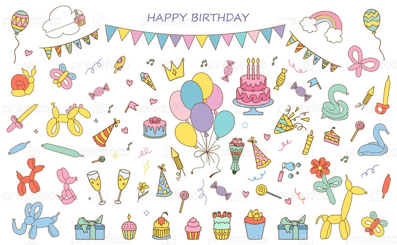 Коллекция элементов дизайна вечеринок и праздников. Набор иконок для праздничных мероприятий и шоу. Предметы для дня рождения и годовщины. С тортом, карнавальными масками, петардами, фейерверками, подарками, напитками, флагами, серпантинами. Векторная илл