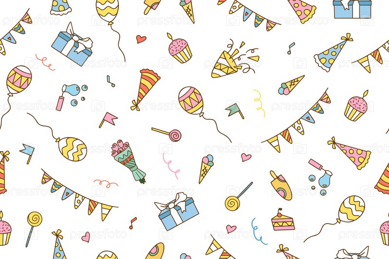 Праздничный бесшовный узор из красочных элементов в стиле каракули С Днем Рождения, изолированный на белом фоне. Векторная иллюстрация. Векторная иллюстрация