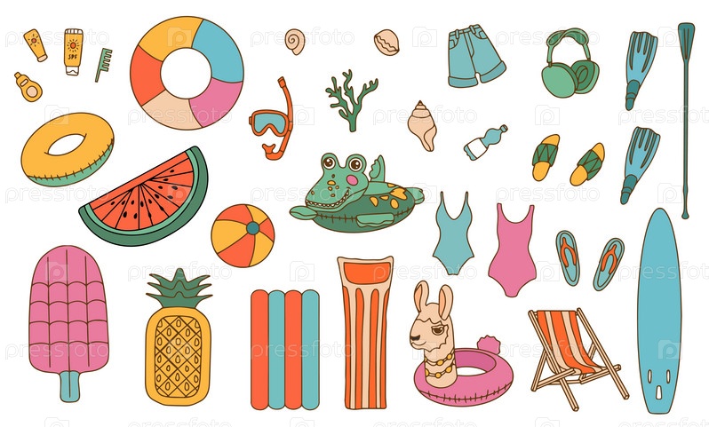 Набор иконок летнего контура. Векторные иконки пляжных аксессуаров для веб-сайтов. Тропический отпуск. Векторная иллюстрация